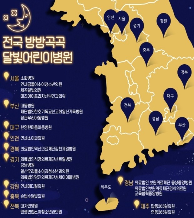 전국 달빛 어린이 병원은 아래 바로가기에서 확인하셔서 도움받으시기 바랍니다.